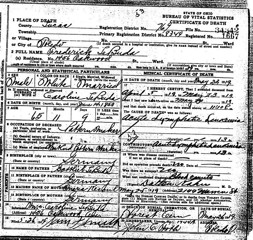 - [S538] Ohio. Division of Vital Statistics, Ohio Department of Health. Ohio, Deaths, 1908-1932, Death Certificate for Frederick LeBuda, listing his parents as Gottlieb LeBuda and Maria Kecoul.
