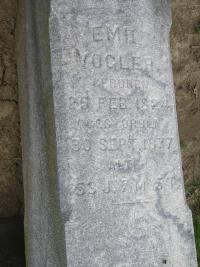 Emil Vogler was born on February 25, 1824 at Prussia.2,1 He worked in 1864 as a Laborer at Columbus, Franklin County, Ohio. He worked in 1866 as a carder in a woolen mill at Columbus, Franklin County, Ohio. He worked in 1867 as a Spinner at Columbus, Franklin County, Ohio. He worked in 1868 as a Laborer at Columbus, Franklin County, Ohio. He married Christina Vogler before 1870 .1 Emil Vogler worked between 1870 and 1876 as a Broommaker at the ED & JC Howard Company at Columbus, Franklin County, Ohio.1 He died on September 30, 1877 at Columbus, Franklin County, Ohio, at age 53.2 He was buried after September 30, 1877 at Green Lawn Cemetery, Plot: Section V, Lot 247, Columbus, Franklin County, Ohio.2