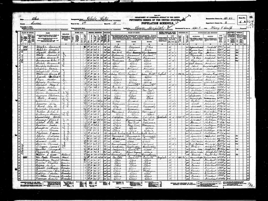1930 Census from Toledo Ohio -Flower Hospital residents
